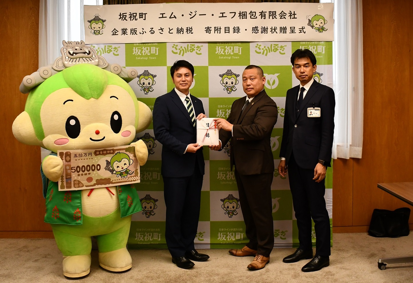 ※写真中央:エム・ジー・エフ梱包有限会社代表取締役森本英明様、写真右:大垣共立銀行瑞浪支店支店長加藤浩隆様、写真左:坂祝町長伊藤敬宏