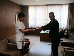 8月27日(火)中央公民館にて、中学3年生の中村佳嵩さん、荻曽悠雅さんが東海・全国大会に出場することを教育長に報告しました。