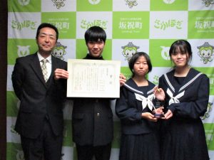 1月15日(水)に中央公民館にて、坂祝中学校2年生の長谷川豪治さん、山﨑愛華さん,横幕莉子さんが中学生学校給食選手権で最優秀賞を受賞したことを教育長に報告しました。
