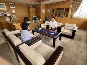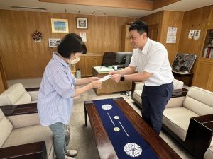 山下さんは、「前向きな気持ちで頑張っていきたいです。スポーツができるときに楽しみたい。」などと抱負を述べ、町長からは、「会場が遠く、行くのも大変かと思いますが、頂点を取れるように頑張ってきてください。」と激励を受けました。