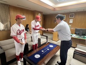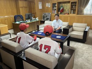 10月8日(水)役場にて、中学3年生の兼松宥成さん、松田蒼甫さんが全国大会に出場することを町長に報告しました。兼松さん、松田さんは、10月11日(土)から13日(月)にかけて愛知県の愛・地球博記念公園野球場等で開催された「オールジャパンベースボールリーグ中等部2025 全国大会」へ出場しました。