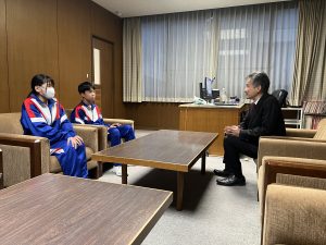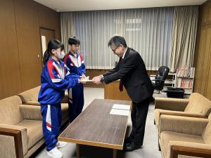 伊藤さん、小栗さんは、「次の中体連に向けて、結果を残せるように練習をがんばります。」などと報告を述べ、教育長からは、「継続してやれているのはすごいことです。周りの人への感謝も忘れずに励んでください。」と激励を受けました。
