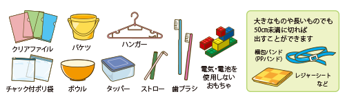 汚れが落ちない容器(マヨネーズ・油など)、 ゴム製品(長靴、ホースなど)、ビニール製のサンダル、 厚さが5ミリ以上の硬いプラスチック製品等。